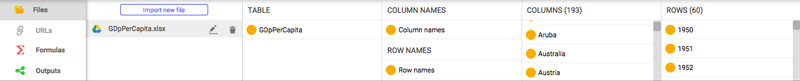 Each row is an entry with id and there is a variable distributed in several columns. (e.g. year, country_1,country_2, etc.). The block with the whole table can be used to visualize series of GDP per country in the Line chart, that will plot one line per column (one line per country).